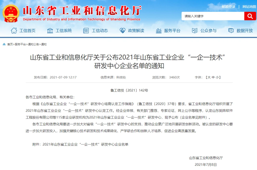 2021年7月9日,山东省工业和信息化厅发布《关于公布2021年山东省工业企业“一企一技术”研发中心企业名单的通知》,烟台岸基网络科技有限公司被认定为山东省“一企一技术”研发中心。