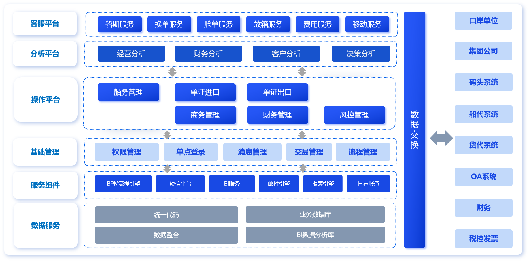 面向船代公司提供完整业务操作解决方案,通过“互联网+”服务模式满足企业内部操作需求。支持船务、单证、箱管、商务、财务等多部门协同,搭建智能高效业务平台,实现线上线下“一站式”服务。 适用于集装箱/散杂货、干线/支线、外贸/内贸等全代理模式。