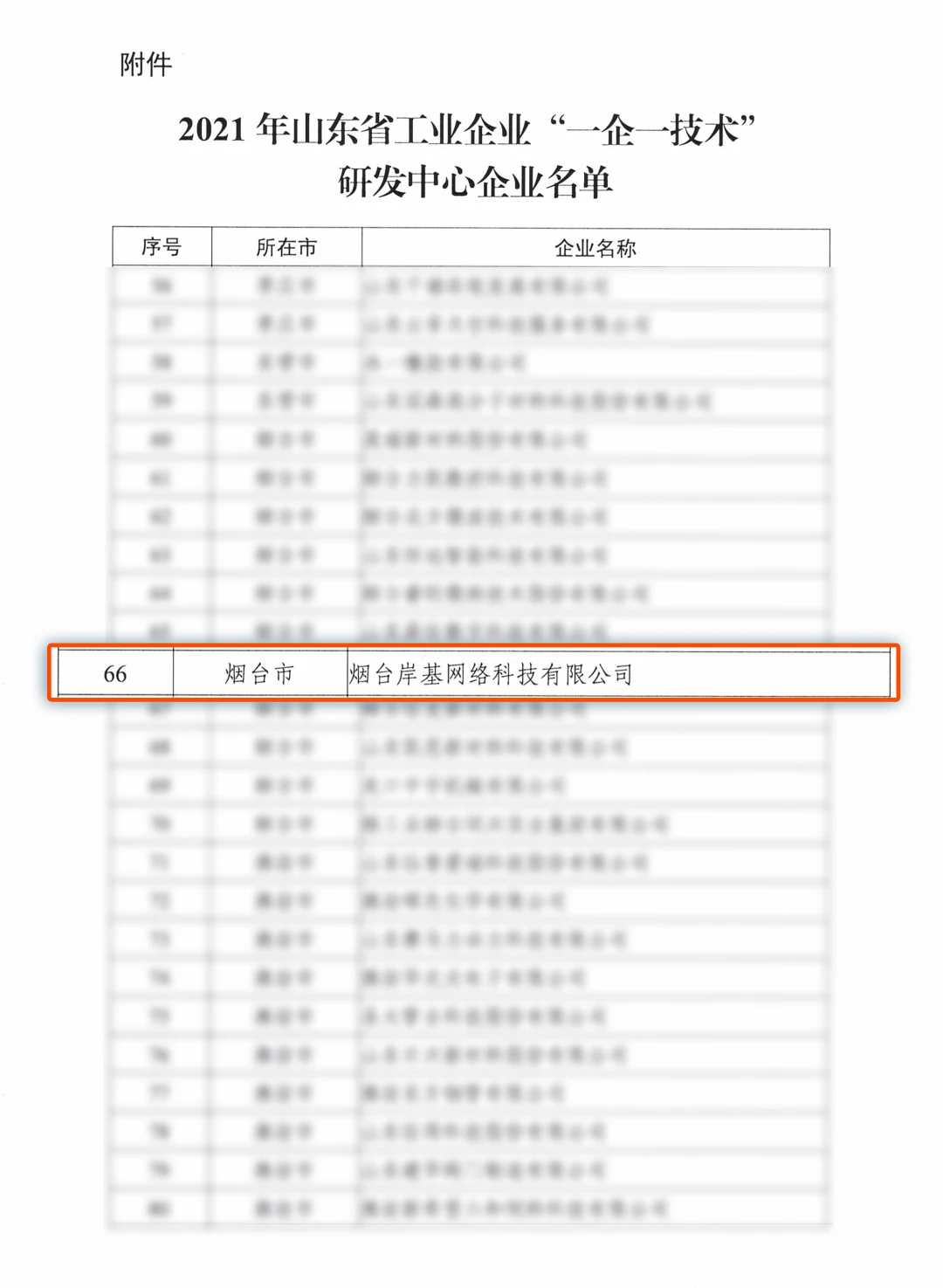 2021年7月9日,山东省工业和信息化厅发布《关于公布2021年山东省工业企业“一企一技术”研发中心企业名单的通知》,烟台岸基网络科技有限公司被认定为山东省“一企一技术”研发中心。